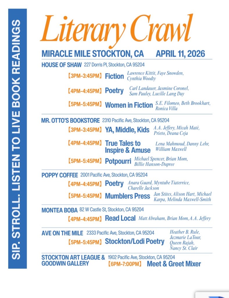 tart planning your Literary Crawl stops now! Join us Saturday, April 11th on the Miracle Mile for an afternoon of stories, poetry, and creative expression.